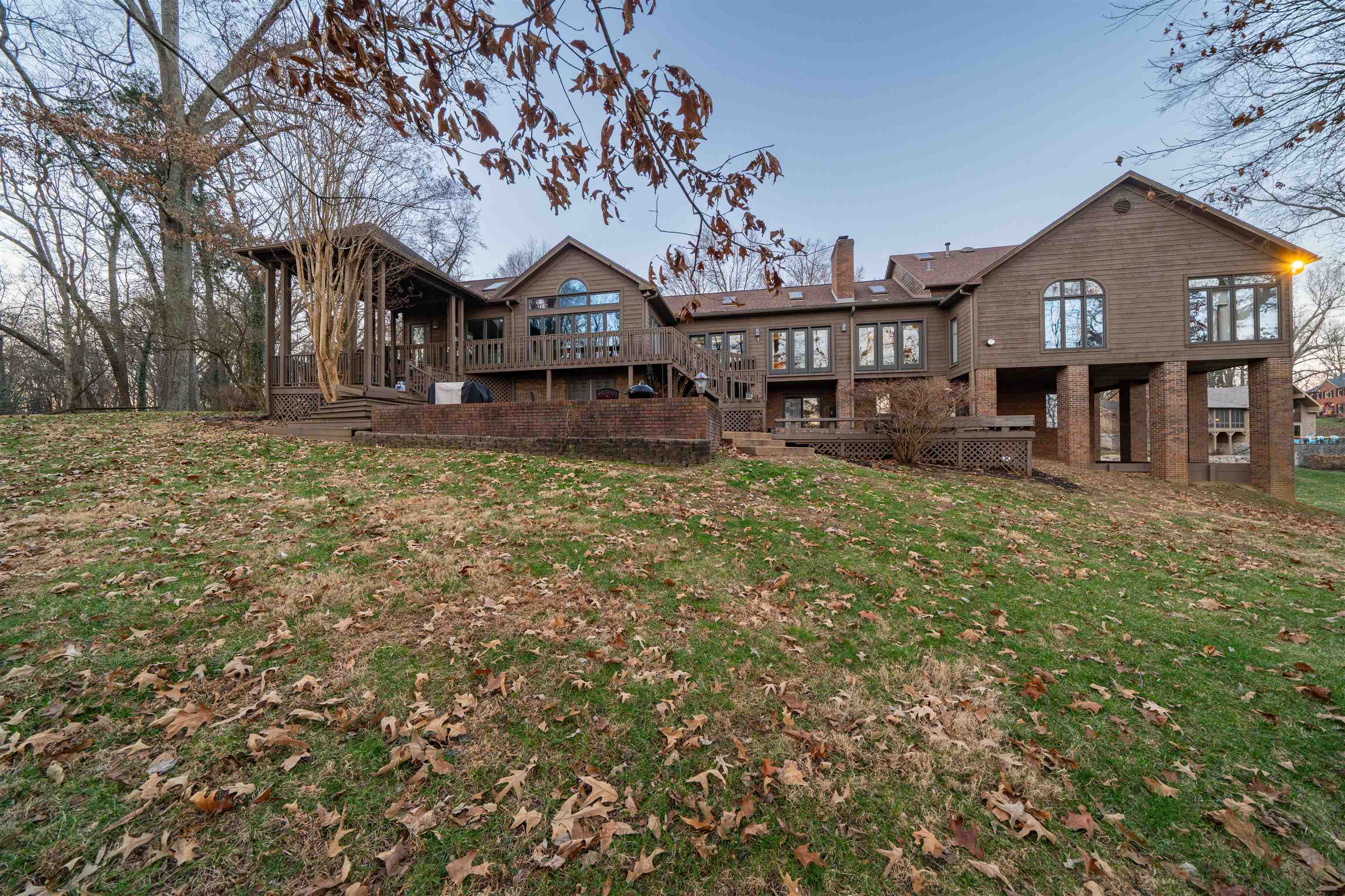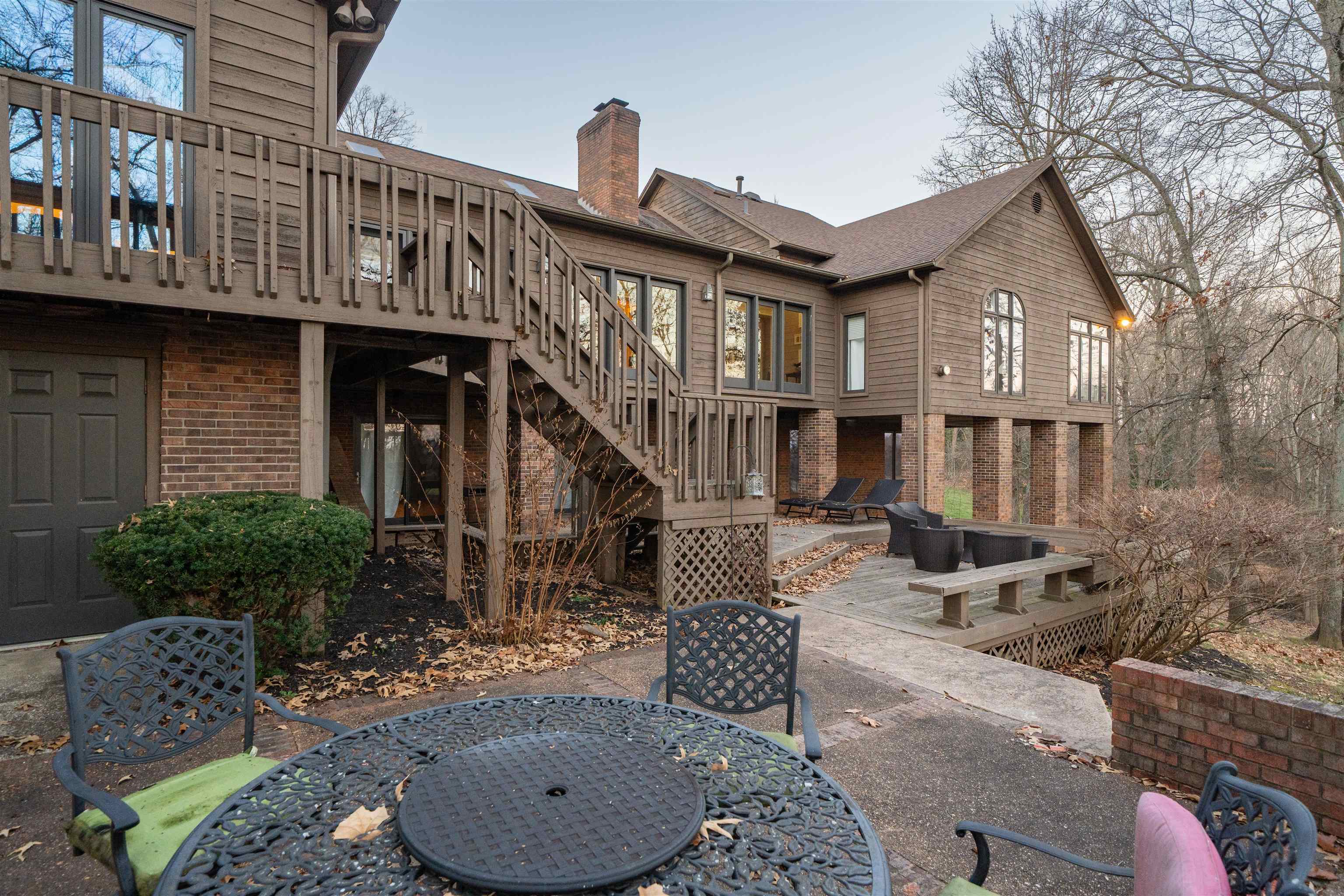 Set on a private 1.3 acre lot on a dead end street, this expansive home offers over 6,500 finished square feet designed for both everyday living and entertaining. Crown moulding, vaulted ceilings, skylights, and an abundance of natural light create a bright, open feel throughout the main living areas. The main level primary suite is a true retreat featuring a fireplace, sitting area or office, and a spacious en suite bath. Walk in closets are found throughout the home, offering exceptional storage. Multiple living spaces on the main level allow flexibility for formal and casual use, along with an additional large office positioned at the front of the home. The finished walk out basement adds another living area complete with a kitchenette, making it ideal for guests, multi generational living, or entertaining. A secondary washer and dryer hookup is located in the basement, in addition to the main level laundry. Outdoor living is just as impressive with a tri level deck overlooking open fields, a fire pit area just off the deck, attached outdoor storage, and a peaceful, wooded setting. Additional features include multiple fireplaces, granite surfaces, skylights throughout, and a triple attached garage. This property offers privacy, space, and versatility while remaining close to Owensboro conveniences.